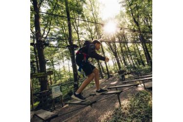 Profitez aussi de 4 parcours accrobranche : progressifs en difficulté et en hauteur, jalonnés de ponts, de filets, de tyroliennes ou de sauts. Vous évoluez de plateforme en plateforme, avec successions de passages plus ou moins périlleux : une expérience impressionnante et délirante ! 8 autres parcours accrobranche attendent aussi les plus grands.