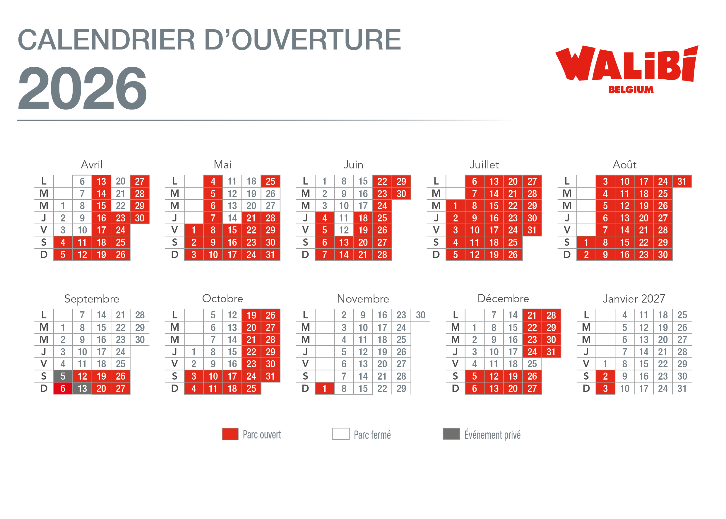 Billet non daté 1 jour saison 2026: Valable 1 jour du 04 avril 2026 au 03 Janvier 2027 ( selon calendrier d'ouverture sur www.walibi.be/fr